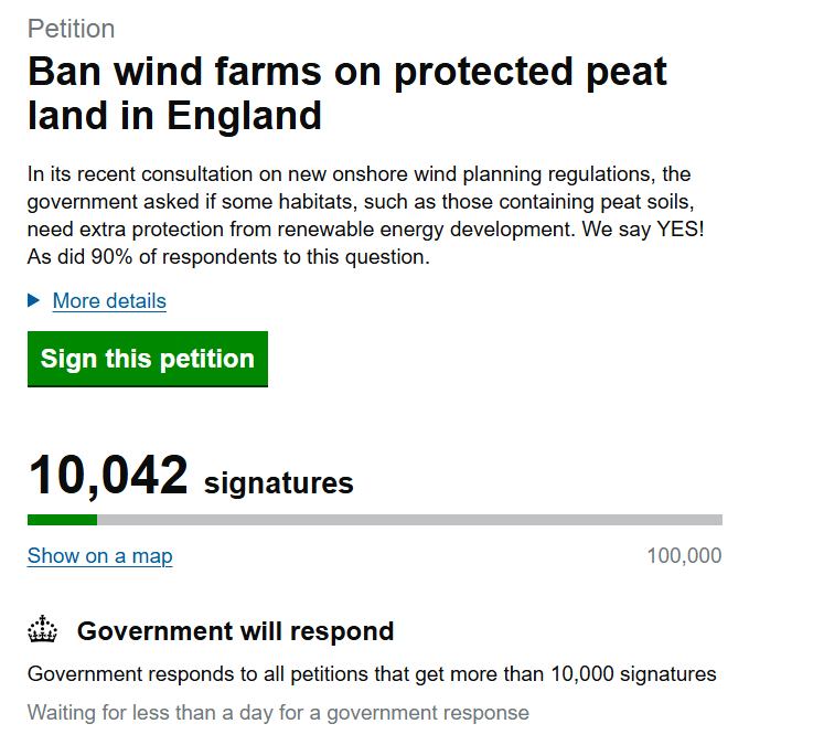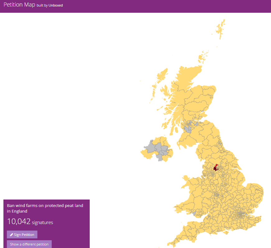 I find it interesting how a focussed local campaign, on a national issue, can do so well in a small geographic area. Over a third of the signatures come from just two affected constituencies – Calder Valley and Keighley and Ilkley. Imagine what would happen if some large environmental organisations threw some weight behind it too… And why don’t they?