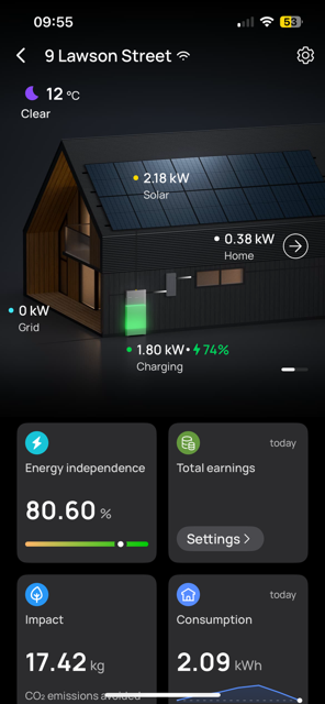 It’s a sunny morning and our solar panels are generating 2.18kW but the house is only using 0.38kW so the balance, 1.80kW is topping up our battery which is 74% full (and my phone battery is 59% full). Before lunchtime our battery will be full (I reckon) and we’ll be exporting to the grid and (once the paperwork is done) getting paid for it. The battery will be depleted overnight with freezer, fridge and wi-fi running but it will still see us through until mid morning and if it’s another sunny day then we go round a similar loop again. Rainy, cloudy December days will be different!