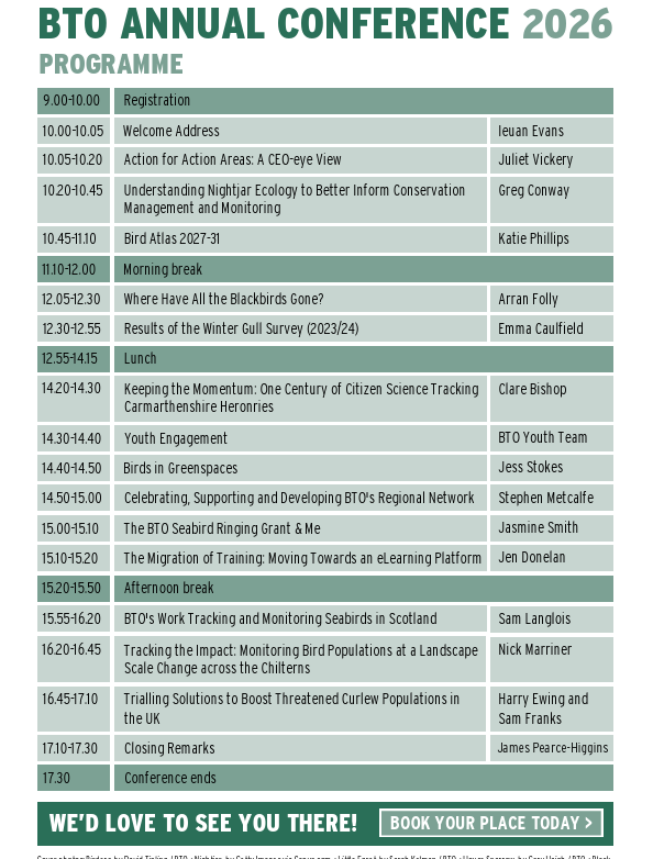 It would be normal to say that I was attracted to the conference by the talks on offer, but I booked a place before I knew what they all would be or who was making them, so I was attracted by the organisation and by the hope and expectation that there would be good talks and by the fact that I assumed I would meet a lot of people whom I know but rarely see. The schedule was well-judged to enable friendly chatting and well-presented talks. My brain remembers graphs and maps and tables and there were some memorable ones; where Kittiwakes go between breeding seasons, where Nightjars forage in the Brecks, the difference in Blackbird BirdTrack reporting rate in London from 2022 when Usutu virus was detected, that Shags dive to the bottom to feed and the fact that it is mammals gobbling up Curlew eggs (no surprise). I can remember that the next Atlas project will have the Welsh Ornithological Society and the RSPB as partners, that Common Gulls might be called Commonish Gulls, that there is a fine project attempting to measure success of agri-environment schemes in the Chilterns, that auks can hurt and that Grey Herons used to like big country houses in southwest Wales.