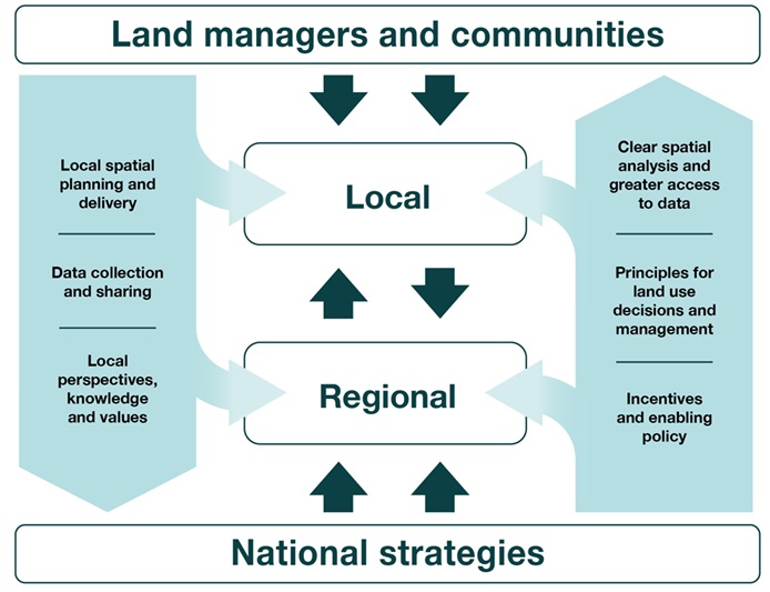 The top diagram has useful information about how much of broad land use types exists now (I’ll try to remember those figures); the middle diagram just reminds me of lots of pointing fingers with the caption ‘I thought they were going to do it, not me’; and the third, the pair of maps is very interesting, being two ways of looking at where most change is needed (the darker, bluer areas).