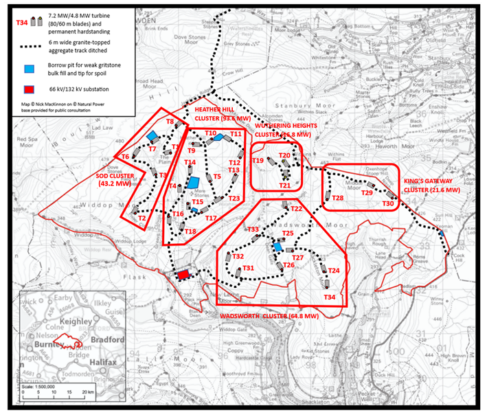 On well-sited wind farms there is far less local disruption during construction because almost all the stone is won on-site from borrow pits. The weakness, porosity and susceptibility to frost of West Yorkshire gritstone when crushed to aggregate means that on-site stone can only be used as bulk fill in the deep subbase of roads, and not at all in concrete. The six borrow pits that are proposed (swimming-pool blue in the first map) are mainly to create voids to dump the excavated peat and other spoil. The bulk fill extracted from the CEP borrow pits is equivalent to the cheap waste from the quarrying of the high-quality building stone that defines Brontë Country. The PEIR should include a full account of the stone deliveries.