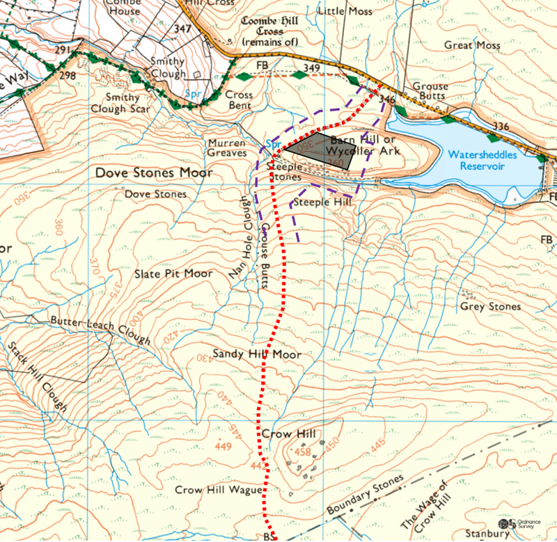 The alignments seem to require a new bridge here, rather than use of possibly adequate public one, because the bypass immediately goes up the side of Rattan Clough at a 13% gradient. Another sudden change of direction to avoid the SSSI moorland brings the road across Herders Common to another awkward alignment with the public road near the entrance to Foster’s Leap.