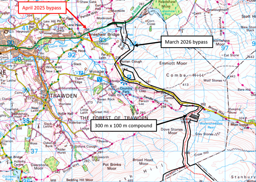 The disastrous Logika Scoping Report of September 2025 was still unsure about where the stone was coming from; the implied model was to do the civil engineering from the east at Cock Hill on the A6033 and then deliver the turbines from the west through Colne. It was clear to us that this was not going to work if most of the imported stone had to be granite brought by sea to Ellesmere Port, not sphagnum-killing limestone from the Dales, because the granite deliveries could not get up out of Hebden Bridge. It was clear that all the stone as well as the turbine components would have to come through Laneshaw Bridge.